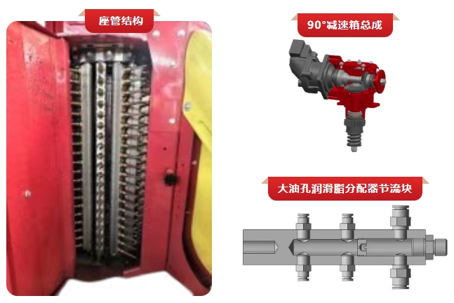 座管总成使用大油孔润滑脂分配器节流块,增大油孔直径,保证齿轮和辊道座得到充分润滑