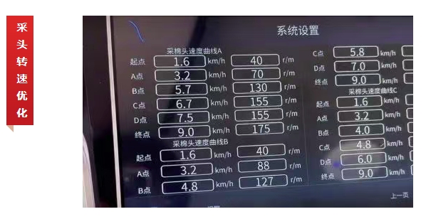 智能采摘模式可调节转速适应不同水分的棉花收获,内置三种采头转速程序,可根据作业环境及产量自动匹配转速,保证高采净率的同时降低含杂率,轻松应对各种棉花产量。